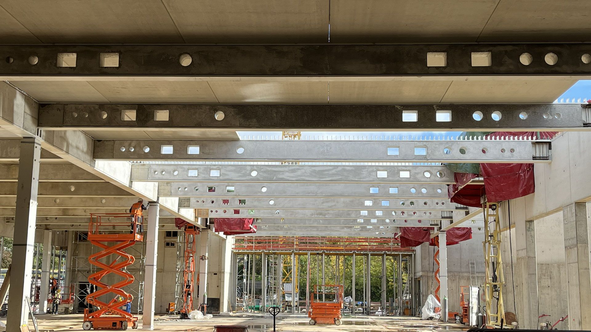 Die aus schweren Stahlträgern bestehende Konstruktion bildet die Decke über der Fahrzeughalle, die als Abfangkonstruktion für die beiden darüberliegenden Vollgeschosse dient. Zur Herstellung der R90 Feuerbeständigkeit werden alle Träger mit Kammerbeton ausgeführt.