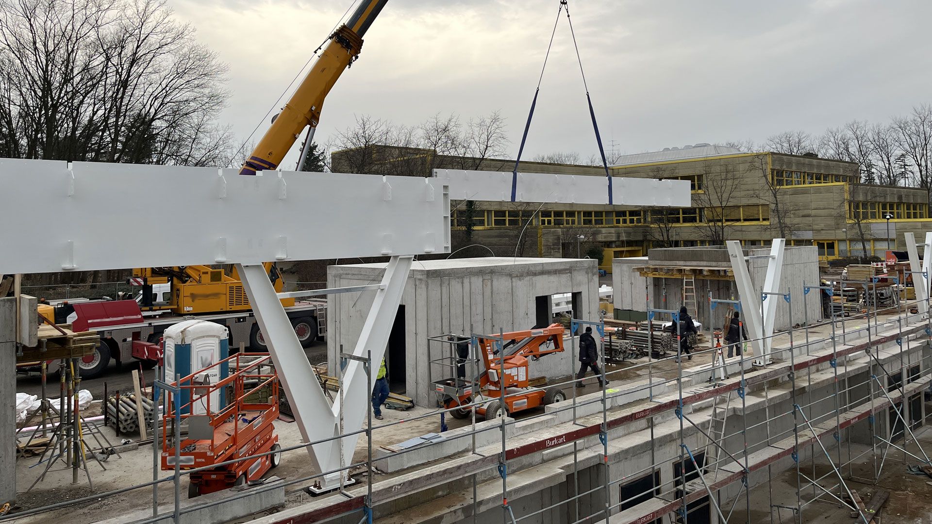 Am Schulzentrum Südwest entsteht eine neue doppelte Dreifachsporthalle. Vollack verantwortet die Stahlbauarbeiten der aus V-Stützen und Kastenträgern bestehenden Konstruktion.